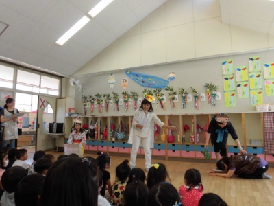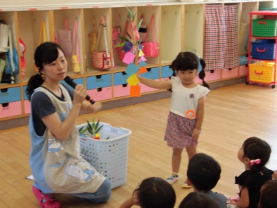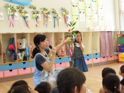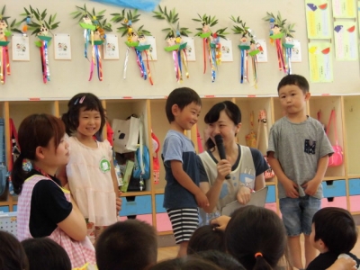 はじめに、先生による劇「たなばた物語」を観ました。天の神や織姫、彦星、牛になって、わかりやすく七夕のお話を子ども達に伝えました。