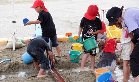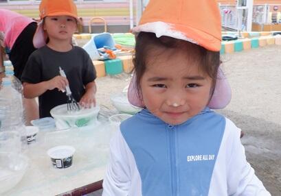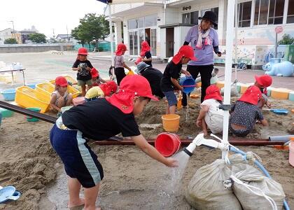 その他、今日は・・・・年長さん達は、砂場の道具洗いです。