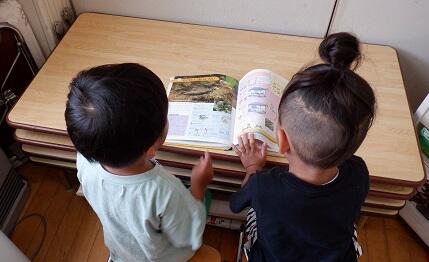 男の子達は、昆虫が大好きです。図鑑で 調べもの? 下
