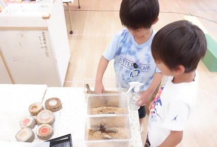 朝は・・・カブトムシ・クワガタの世話をする男の子がいました。下