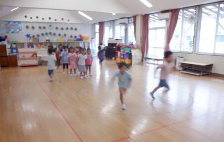 鬼ごっこ。つかまった子は、フラフープの下を潜ります。