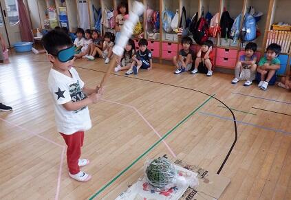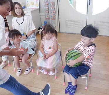 そして、今日の誕生会のプレゼントは スイカです。「おもーい」です。 下