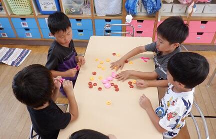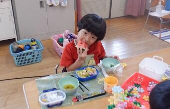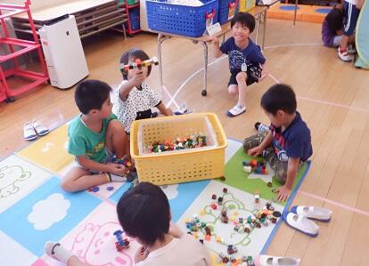年少さんは、お花のブロックをつなげて遊んでいました。下