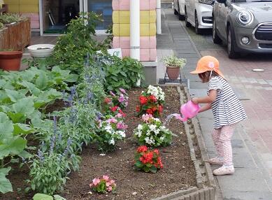 年少さんの女の子は・・・・「かわいいね」と言いながら 水やり。下