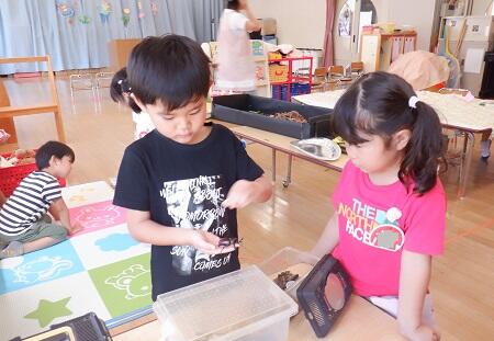 ダンゴ虫を 大事そうに運ぶ 年中さん二人。 下