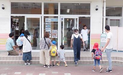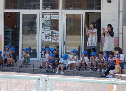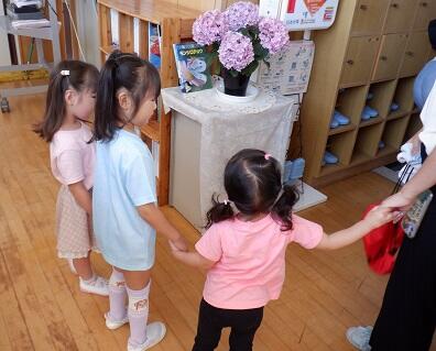6月11日(火)朝です。年中さんと年少さんが 職員室にやってきて