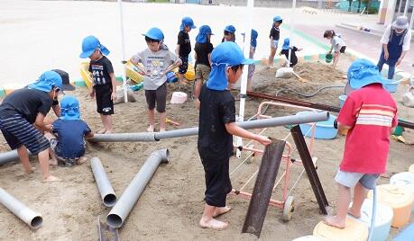 みんなで 水を汲んできて 水を溜めたりしました。 下