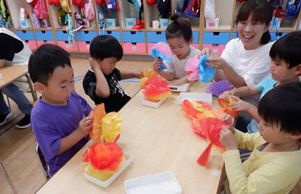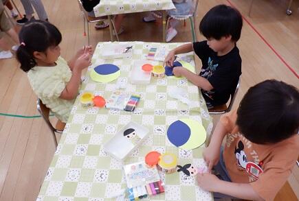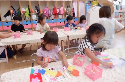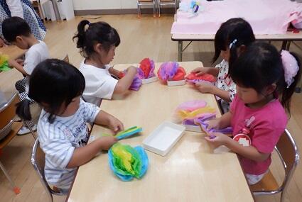 年少さん達は・・・三角の折り紙を 糊付けして つなげました。