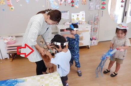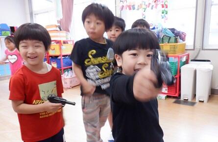 下の子が、水鉄砲で攻撃しているのは・・・・担任の先生です。