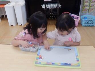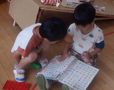 年少さん・・・「何を見てるの?」「ぼくにも 見せて~」「いいよ」かな? 下