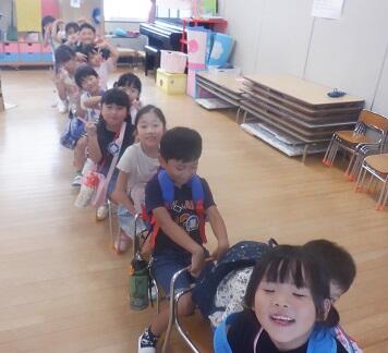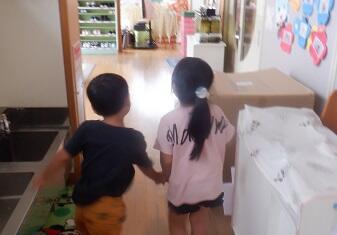 おまけ・・・年長さん達 遊戯室にお昼を食べに 「レッツゴー」下