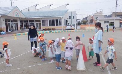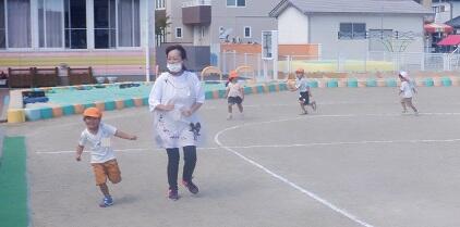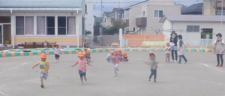 年少さんは 外で リレー。なんと 園庭1周 走りました。