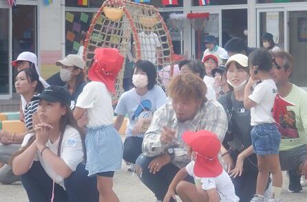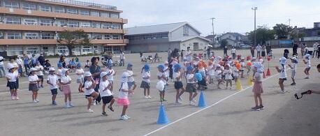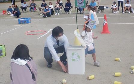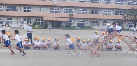 小学生と一緒に 運動会の競技を楽しんでいます。 下