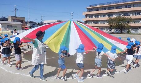 下は、年長さんのパラバルーンを 年中さんと一緒にやっているところです。