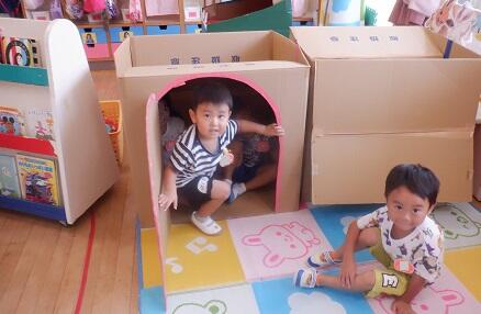 段ボールのお家で 遊んでいました。 何を話しているのかな?