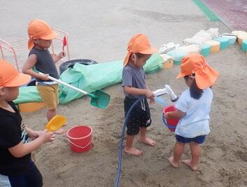 年少さんは 砂場で どろ水遊び 下