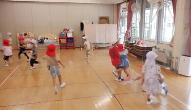 今日は、小雨。遊戯室では・・・年中さんが シッポ取りゲーム