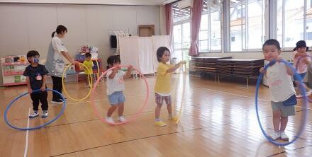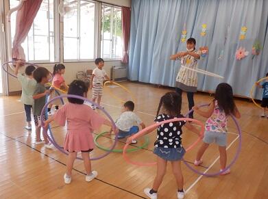 年少さんは・・・遊戯室で・・・・フラフープを使って遊んだり・・・