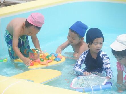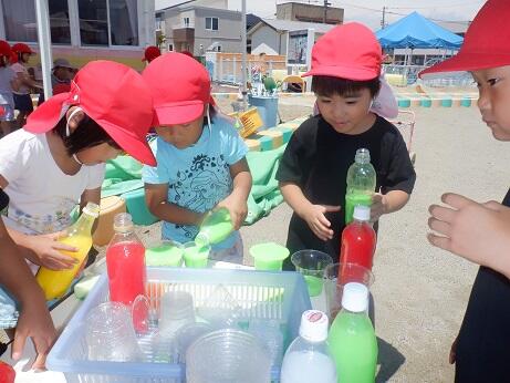 プールで お店屋さんごっこ。「はい、これ どうぞ」