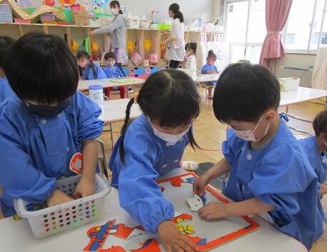 ( 先生方の手作りの )パズルで遊ぶ年少さん。