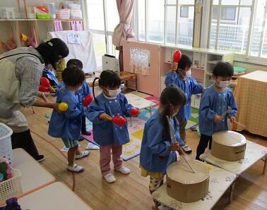 その1・・・ノリノリで 太鼓をする年少の子ども達。