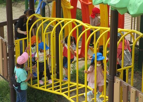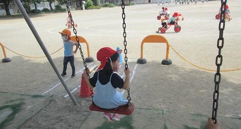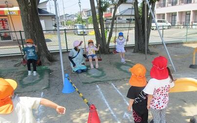 年少さんも 年中・年長さん達のマネをして ルールを守ってブランコにのっていました。