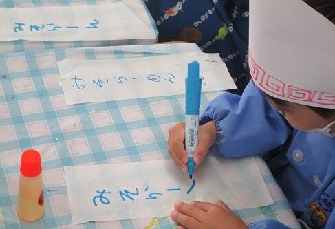 下は・・・・「みそらーめん」とマネして 書いている年長さんです。