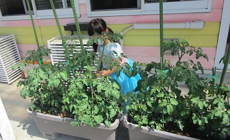 5月24日(火)年長さんは・・・ミニトマトに水やり。