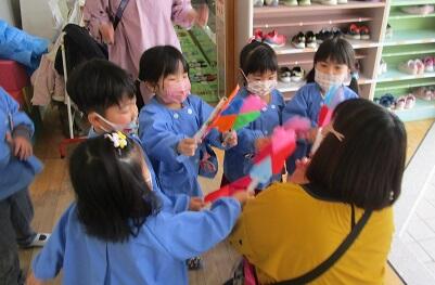 「せんせ、どうぞ!」タンポポの飾りを手渡す年少さん