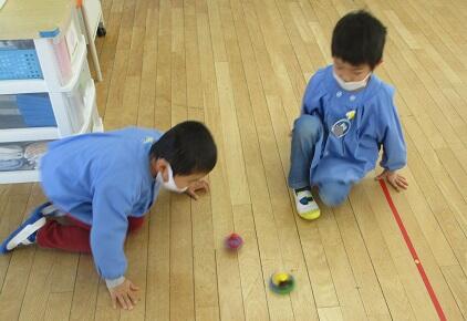 ブロックで・・・コマを作って回す年長さん