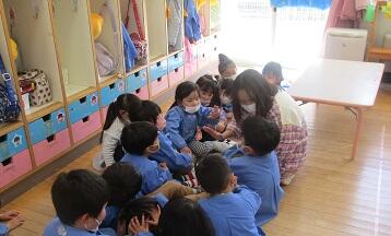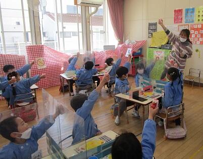 午後です。年中さんが・・・年長さんの教室に・・・・