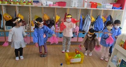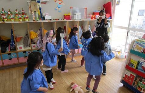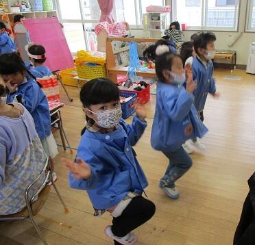 朝、年長さんの音楽劇を 音楽に合わせて まねる年少さん。