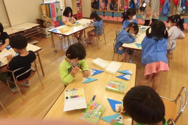 年中さんは、折り紙で・・・雨粒を作りました。