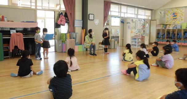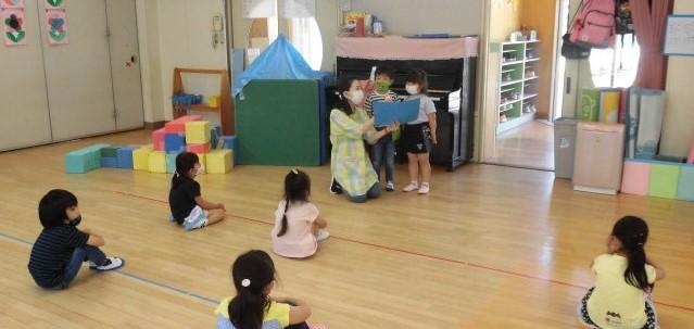 年少さんは、大型絵本「はらぺこ あおむし」のCDによる読み聞かせ。