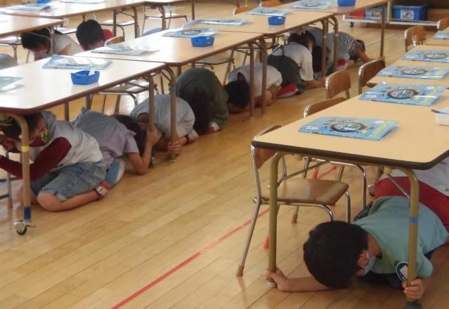 年長さんは、机の下に(机の脚をもって)真剣に潜りました。