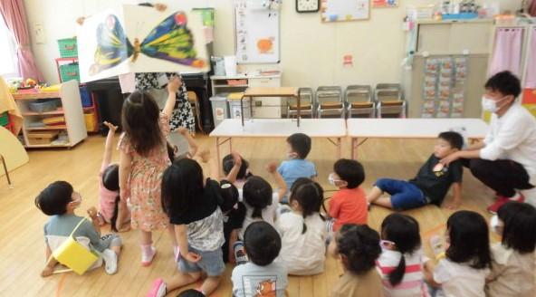 ( きれいなチョウに触ろうとする子ども達です。想像力が豊かです。 )