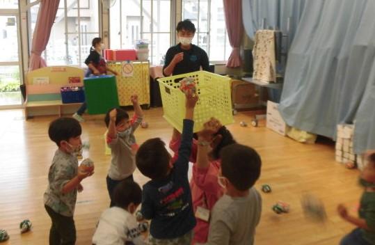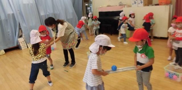 メインの活動としては・・・年少さんは、遊戯室で・・・新聞紙玉入れをしました。