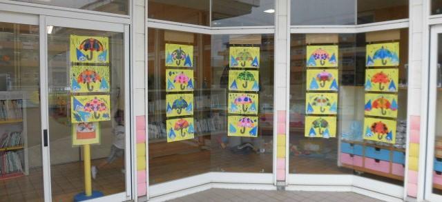 玄関わきには 年中さんの 雨粒の作品があります。