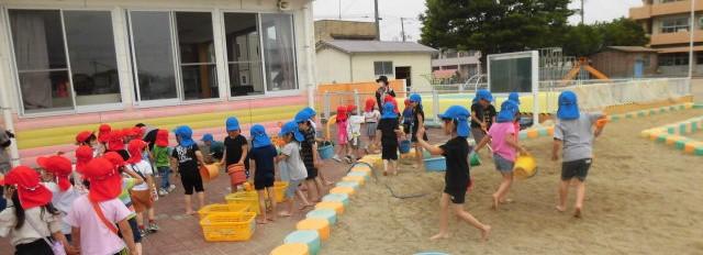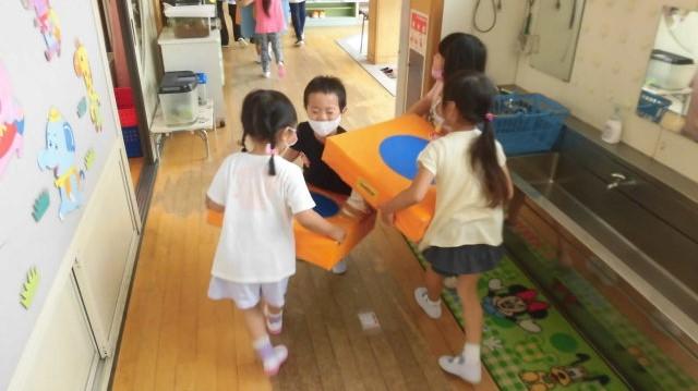年中さんは、朝から「エッサ! エッサ!」お手伝い。