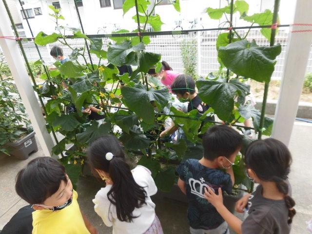 年長さんは・・・・きゅうりの収穫。