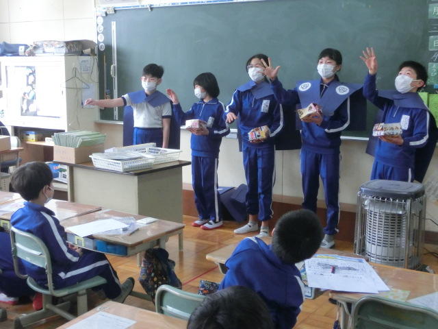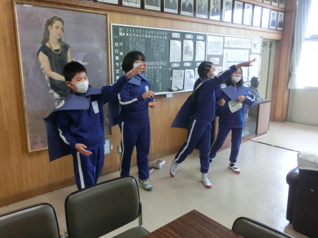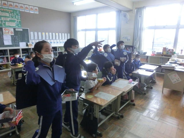 その後、年男年女である5年生が、裃姿で各学級を回って大豆をまきました。5年生は、職員室や校長室にも豆をまいてくれました。