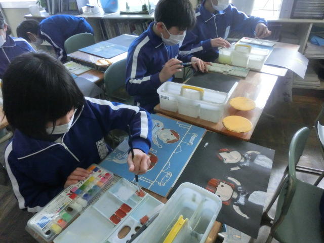 2月6日(木)5年生、図工の授業の様子です。今日の学習は5年生の思い出を版画に彫り、それを絵の具で色をつけ、多色で表しました。作品に名実ともに5年生での思い出の名場面を色鮮やかに蘇らせることができました。