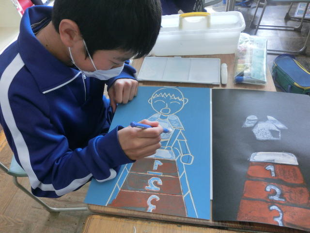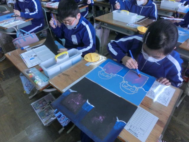 2020年2月6日 14時46分2月6日(木)5年生、図工の授業の様子です。今日の学習は5年生の思い出を版画に彫り、それを絵の具で色をつけ、多色で表しました。作品に名実ともに5年生での思い出の名場面を色鮮やかに蘇らせることができました。
