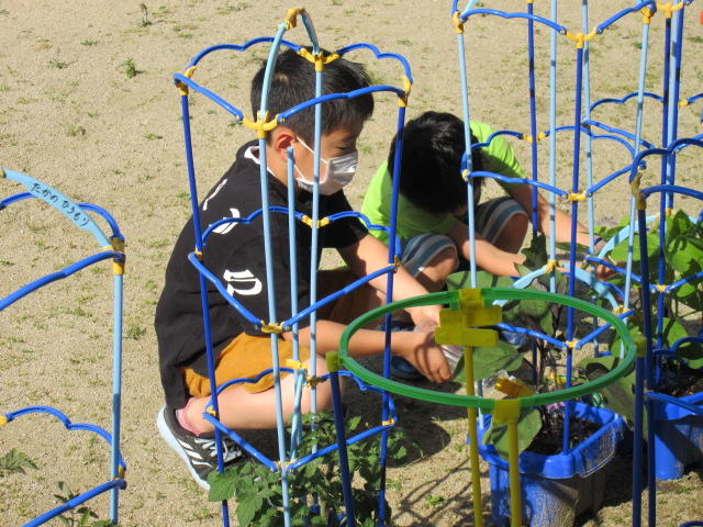 朝登校したら、まず、低学年が行うのは、育てている植物の水やりです。鉢の本葉が日に日に大きくなっていく様は、まるで子ども達のようです。日々どんどん大きくなっています。