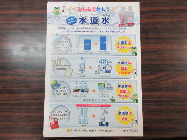 2020年7月27日 11時43分7月27日(月)にいわき市水道局の方がおいでになり「令和2年度水道週間絵画展」で佳作に選ばれた4年生2名の賞状を持参されました。その際、ペットボトル入りの水「いわきサンシャインウォーター」もいただきました。4年生2名の賞状は終業式で伝達します。またペットボトル入りの水は今週中に全員に配付します。