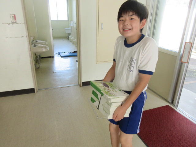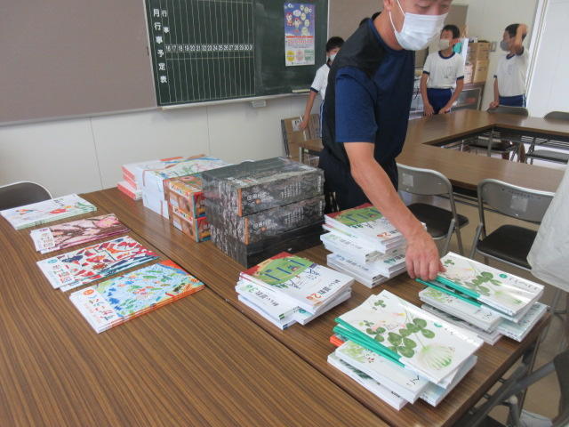 今日から9月です。長月です。秋の夜長、学習も読書もはかどります。学校では、後期用の教科書が児童に配付されました。5・6年生が各学年に教科書を配ってくれました。ご家庭でも新しい教科書を確認してください。