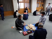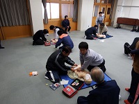 はじめに、心臓マッサージの実技講習を受け、次に人工呼吸の実技講習、その後これらを組み合わせての発見から救急救命までの一連の心肺蘇生実技と行いましたが、かなりの重作業でした。その後、AEDの講習と心肺蘇生を組み合わせた講習となりましたが、心肺蘇生法は全員がかなり慣れてきていたので、とてもスムースに進みました。