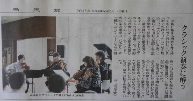 「生のクラシック演奏をバックに校歌を歌った小川中の生徒たちは緊張しながらも、郷土の誇り心平を思いながら歌い切り、盛大な拍手を浴びていた。」