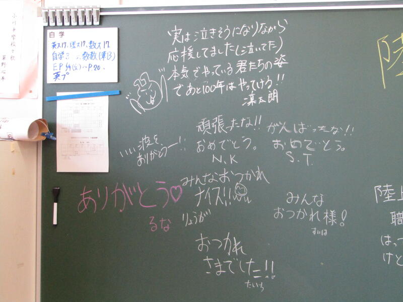 残念ながら、女子は敗れてしましましたが、ここまでの努力は間違いではありません。身近でたくさんの人たちがみんなの頑張りを見てきました。みなさんの努力の凄さは小川中の人たちはみんな知っています。だから、笑顔で帰ってきてください。ご苦労様でした。