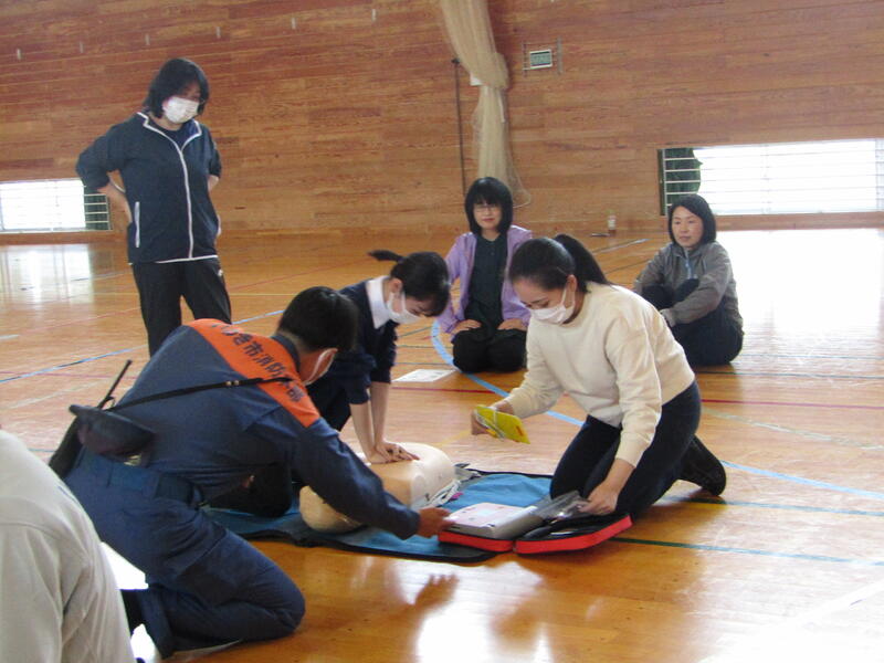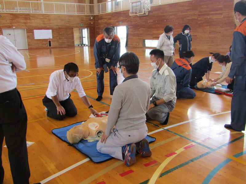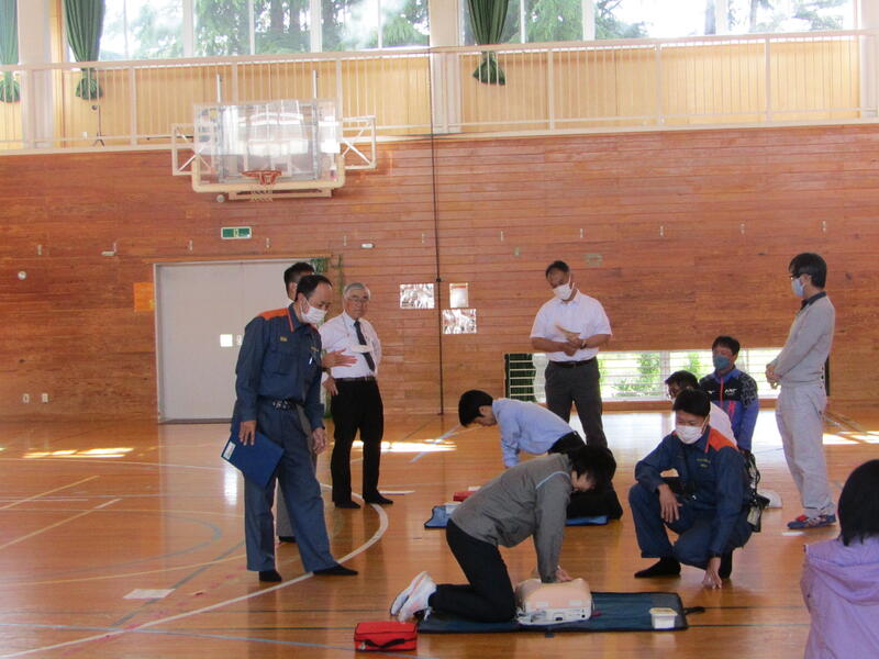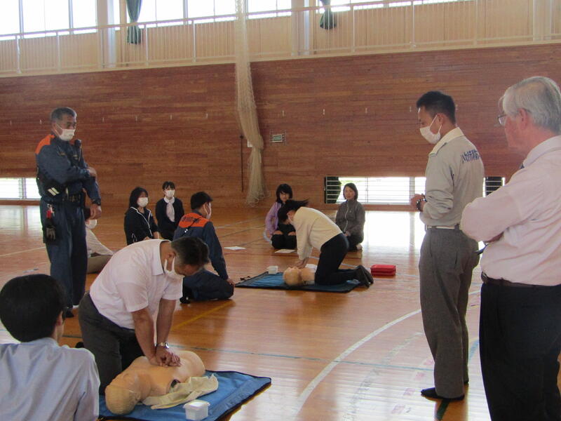 今回は主に、心臓マッサージ、AED使用、エピペンについて、人形を用いて実習しました。
